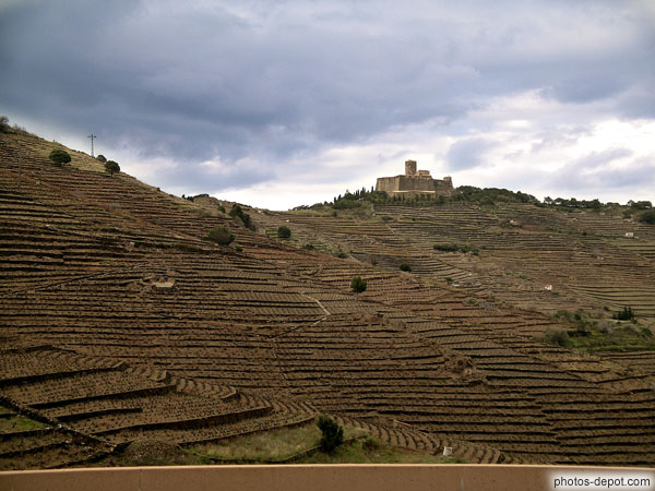 France, Languedoc Roussillon, BanyulsFort surmontant les coteaux plantés de vignes