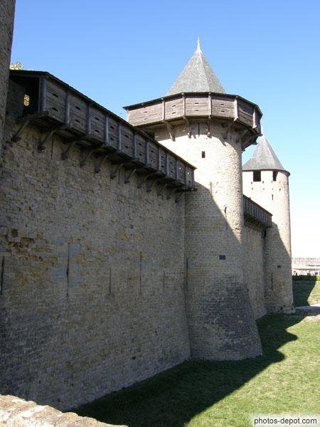 France, Languedoc Roussillon, Carcassonne, Chateau comtalRemparts, tours et hourds de bois ajoutés en temps de guerre