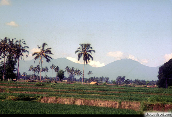 IndonesiePaysage et palmiers se découpant sur les montagnes