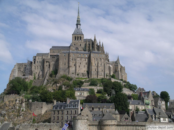 France, Normandie, Mont St MichelConstruit sur unn ilot granitique de 900m de tour et 80m de haut, entouré de remparts,la pointe de l'abbaye culmine à 150m de haut
