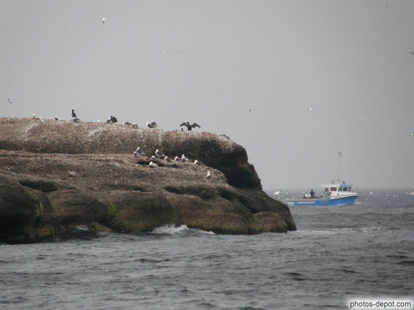 Cormorans sur rocher et bateau, Canada, Gaspesie, Ile Bonaventure