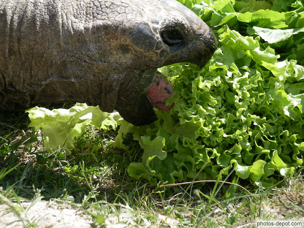 Tortue elephantine d'Aldabra mange de la salade, France, Languedoc Roussillon, Sorede