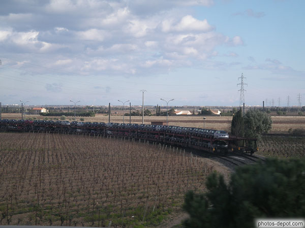 Wagon de voitures dans les vignes, France, Languedoc Roussillon, Salses
