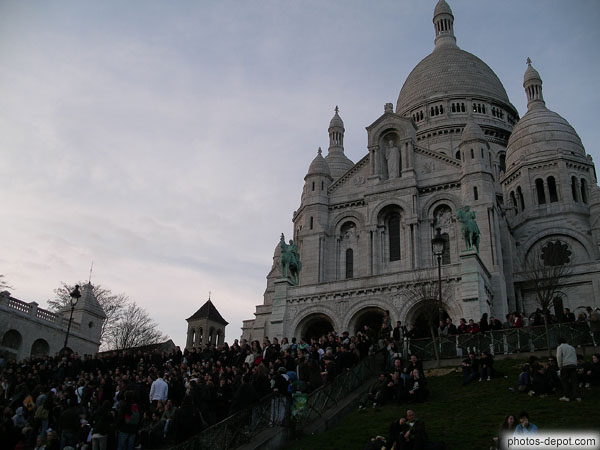 Foule rassemblée sur les marches pour écouter les chanteurs à la guitarre à la tombée de la nuit, France, Paris, Montmartre, Basilique du Sacré Coeur