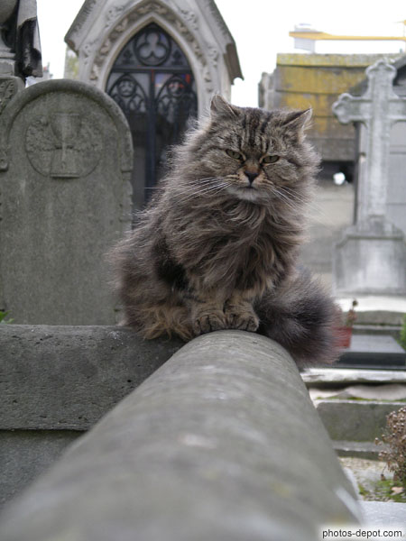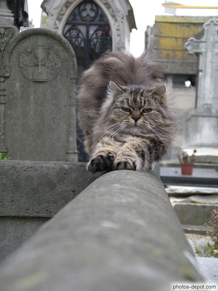 Chat dos rond pattes tendues, France, Paris, Montmartre, cimetière