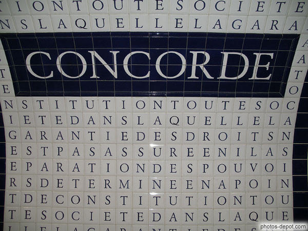 Metro Concorde aux carreaux lettres formant mots, France, Paris