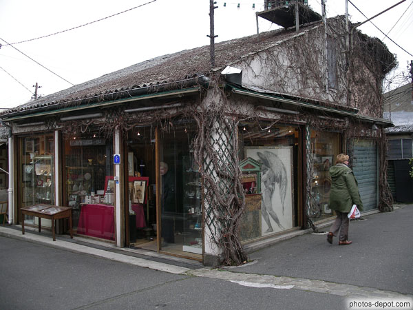 Magasin d'antiquités au lierre envahissant, France, Paris, Puces St Ouen