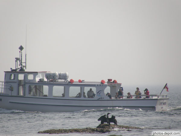 Cormoran à aigrette ailes déployées devant bateau touristes, Canada, Gaspesie, Percé