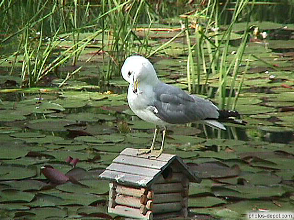 Mouette sur mangeoire dans l'étang, Canada, Montreal, Jardin Botanique