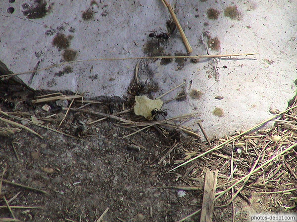Fourmi noire portant un morceau de chips, France, Languedoc Roussillon, Ille sur Tet