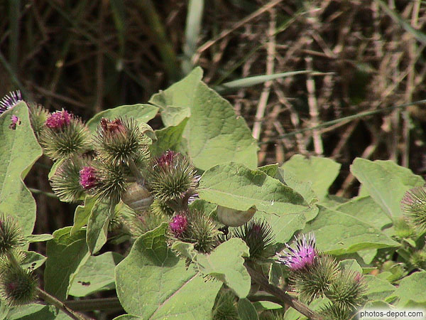 Escargot sur chardons, France, Normandie, Mont St Michel