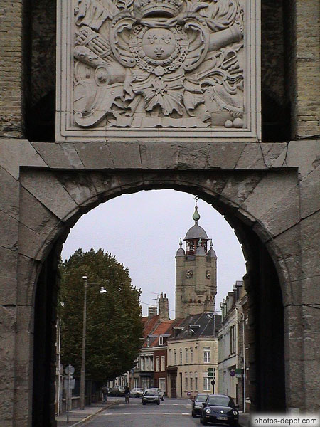 Porte du roi Soleil et beffroi, France, Nord, Côte d'Opale, Bergues