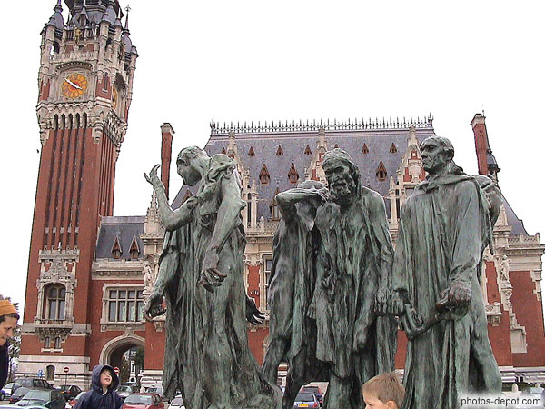Bourgeois de Calais (Rodin 1895) devant l'hôtel de ville et son beffroi, France, Nord, Côte d'Opale, Calais
