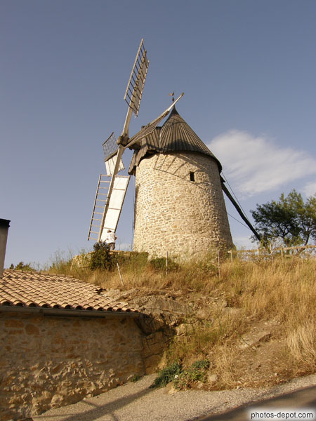Meunier gravissant les pales de son moulin, France, Languedoc Roussillon, Cucugnan