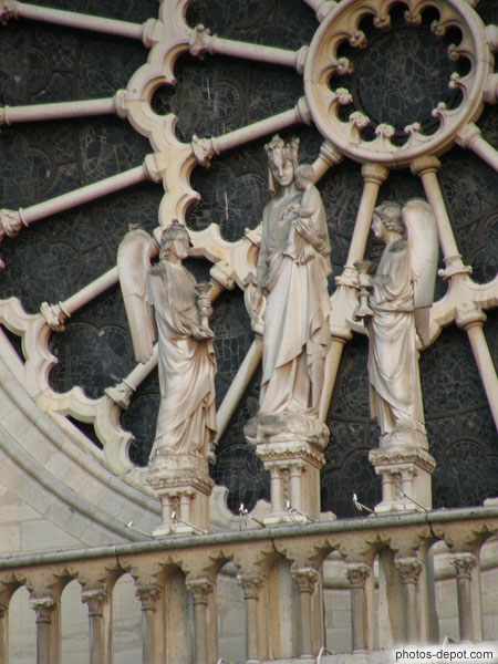Vierge à l'enfant servie par 2 anges devant la rosace de la Cathédrale Notre Dame, France, Paris, Ile de la Cité