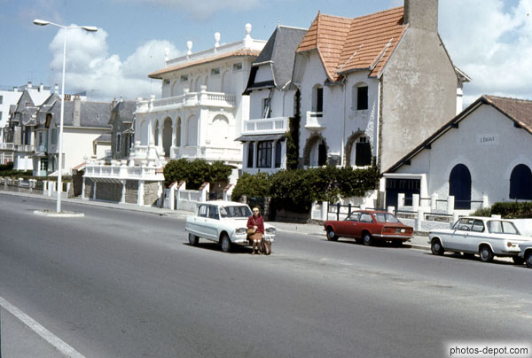 Femme assise sur voiture au milieu de la route, France, Bretagne, Pornic