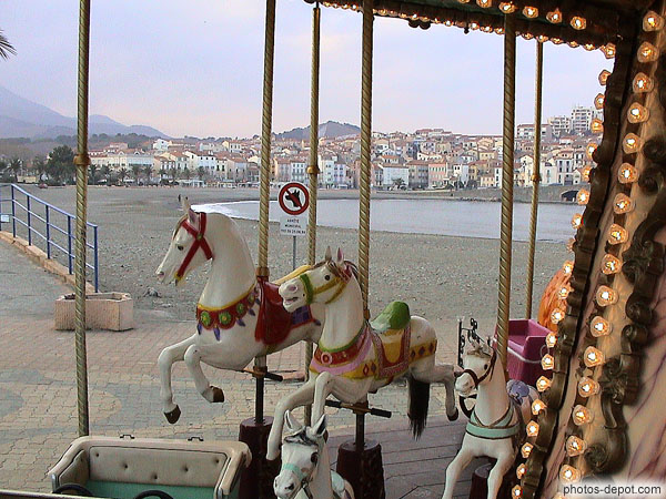 Manège de chevaux de bois sur la plage, France, Languedoc Roussillon, Banyuls