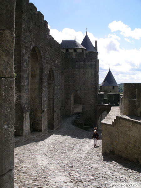 Chemin de ronde aux 2 hauts murs parallèles et tours du chateau, France, Languedoc Roussillon, Carcassonne