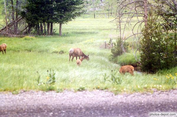 Biches et faons dans le pré, USA, Wyoming, Yellowstone