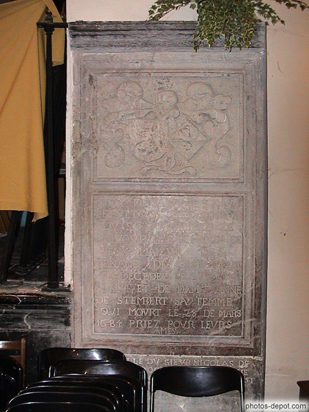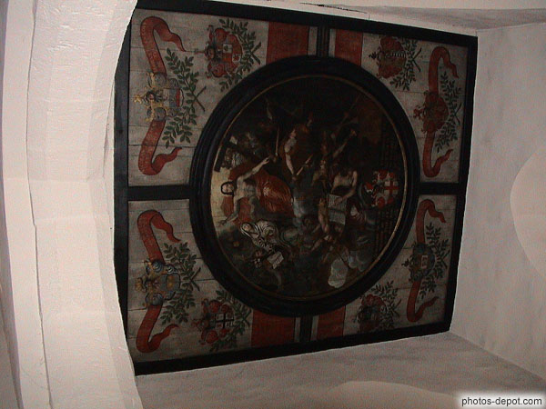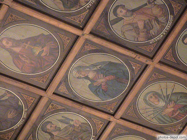 Détail pesonnages peints des caissons plafond plat, Belgique, Theux