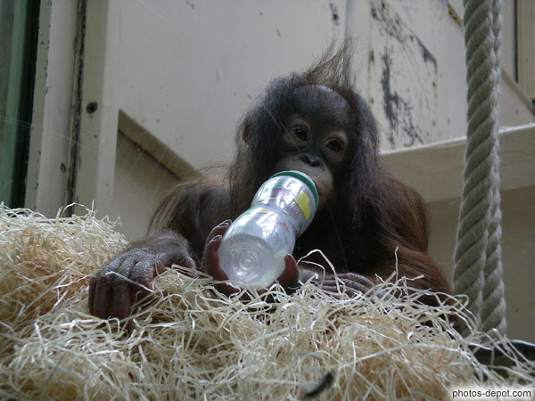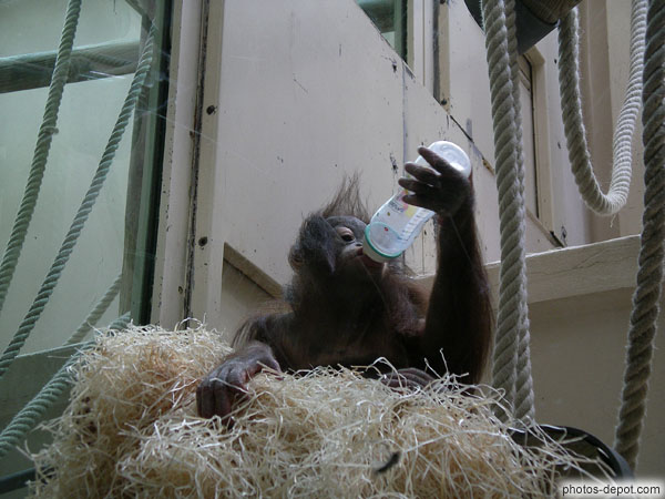 Petit orang outang boit son biberon, France, Paris, Menagerie du jardin des plantes