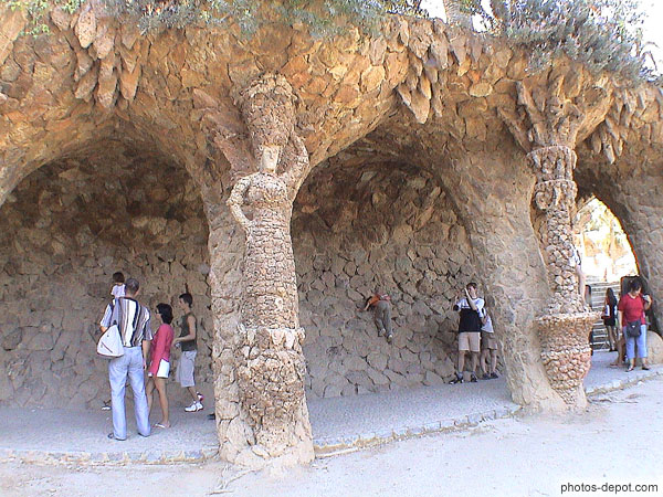 Colonnes-piliers en pierres non dégrossies bordant une avenue couverte de Gaudi, Espagne, Barcelone
