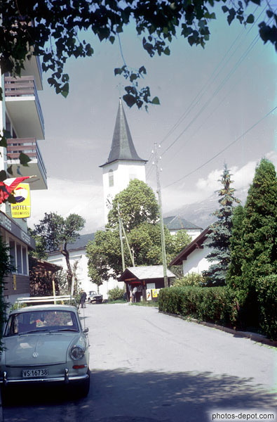 Volkswagen blanche devant hôtel Edelweiss, Suisse, Valais