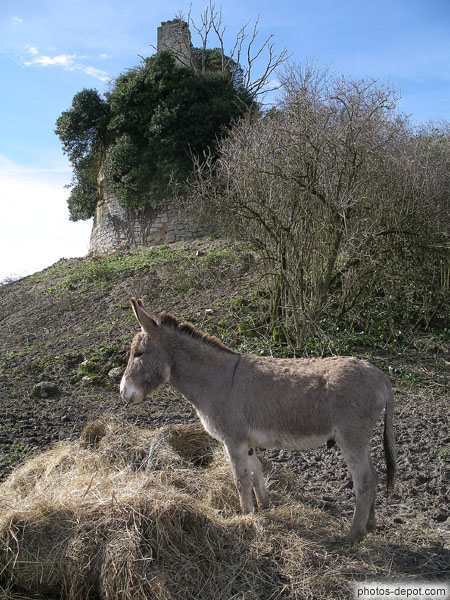 âne devant la ruine du chateau, France, Aquitaine, Gurson