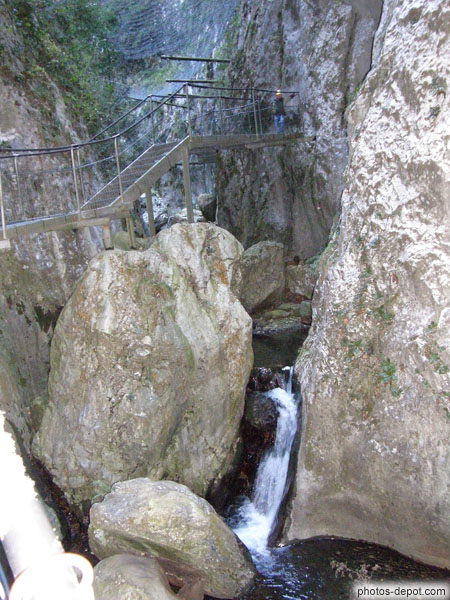 Passerelle sur un énorme rocher, France, Languedoc Roussillon, Gorges de la Fou