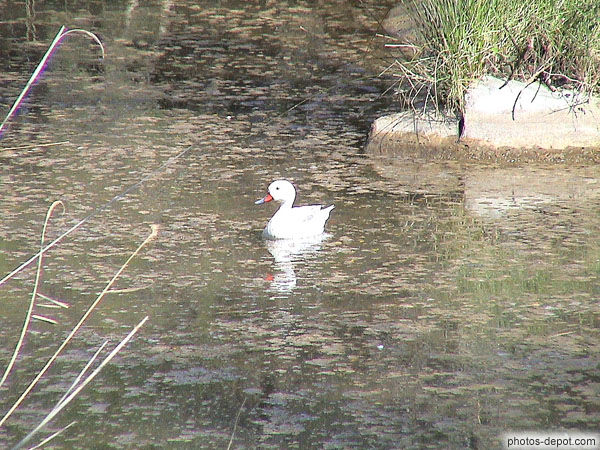 Petit canard blanc au bec orange se reflète dans l'eau, France, Languedoc Roussillon, Réserve Africaine de Sigean