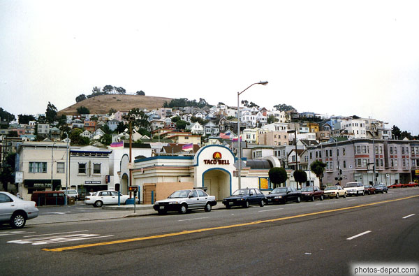 Colline déboisée derrière les maisons et restaurant Taco Bell, USA, Californie, San Francisco