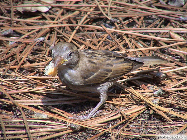 Piaf tient une miette de pain, France, Aquitaine, Contis