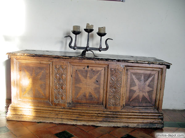 Chandelier sur meuble coffre ouvragé, France, Languedoc Roussillon, Perpignan, palais des rois de Majorque