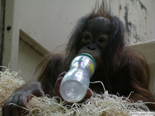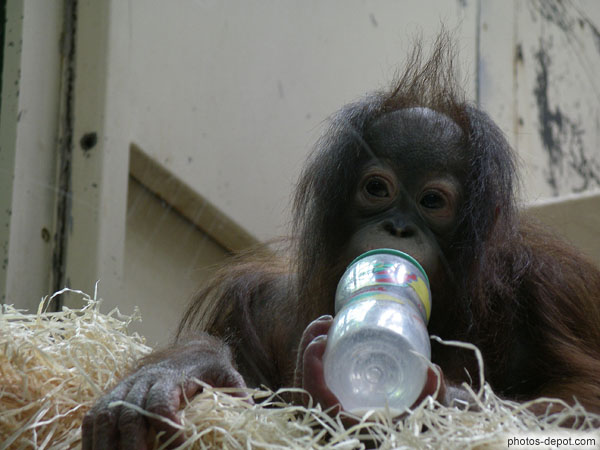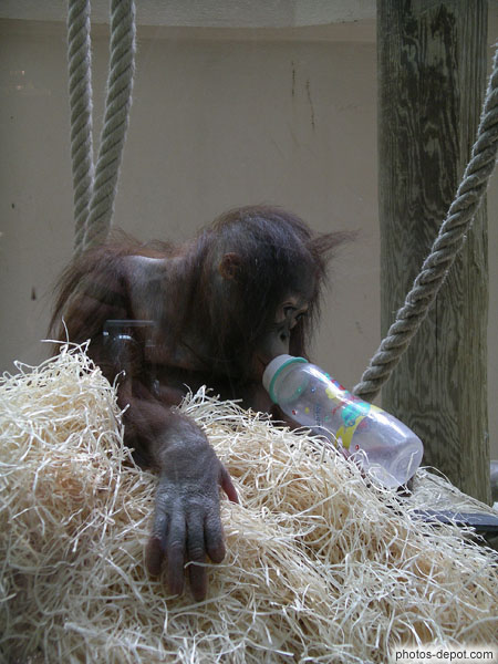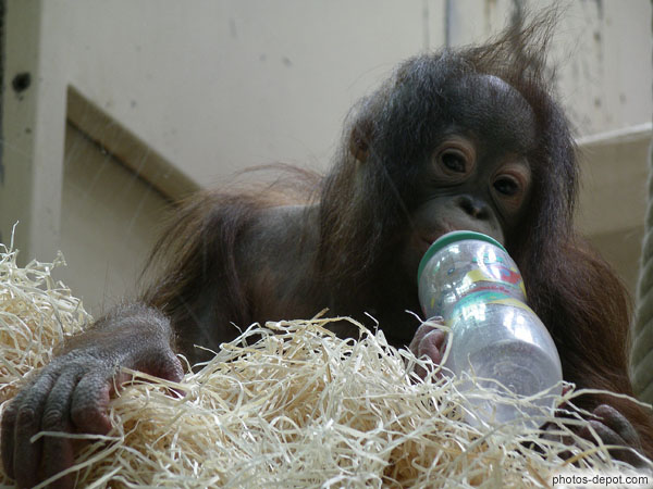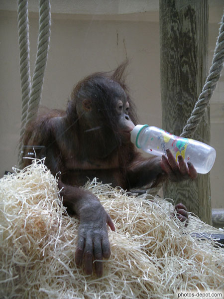 Petit orang outang boit son biberon, France, Paris, Menagerie du jardin des plantes