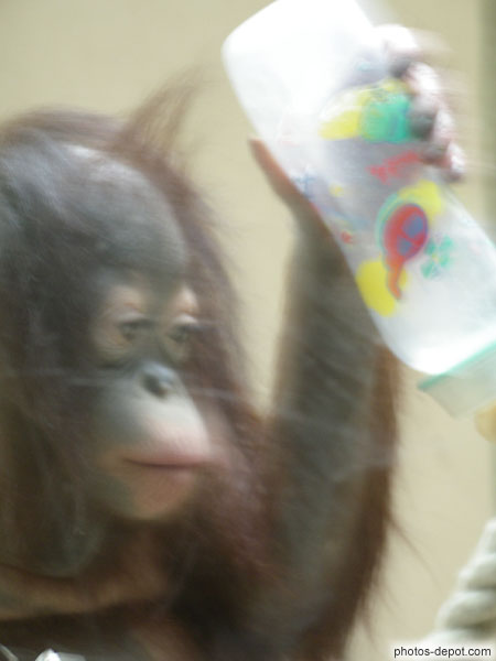 Lingga, petit orang outang abandonné par sa mère boit son biberon tout seul !, France, Paris, Menagerie du jardin des plantes