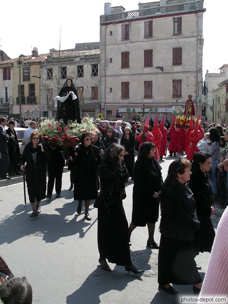 Femmes en noir portant la Pieta, Vierge couronnée au coeur transpercé de poignards, Procession de la Sanch, France, Languedoc Roussillon, Perpignan