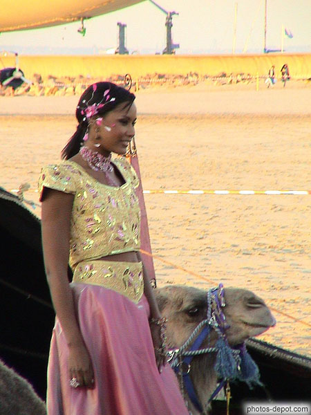 Jeune femme et chameau, France, Normandie, Deauville
