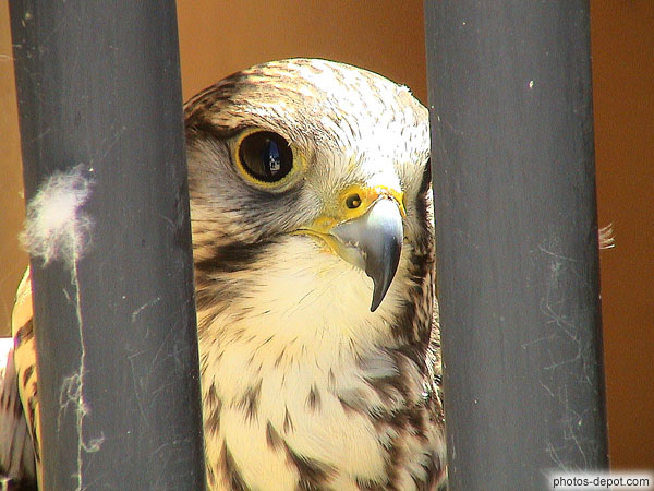 Tête de Faucon crecerelle derriere des barreaux, France, Languedoc Roussillon, Valmy