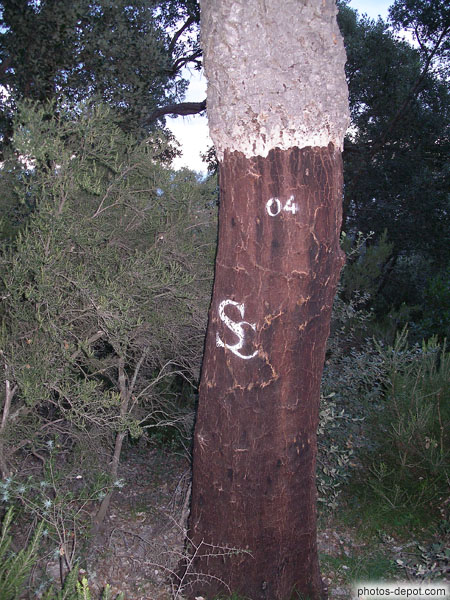 Chêne liège dont l'écorce a été enlevée pour son exploitation, France, Languedoc Roussillon
