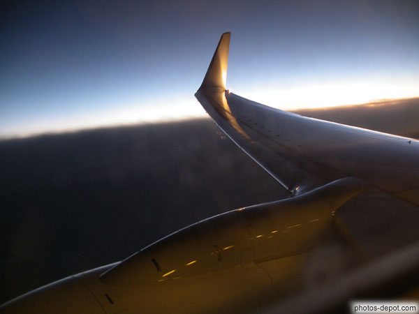 Aile d'avion en vol, Ã l'aurore, France, Paris