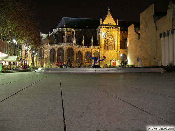 Fontaine aux sculptures modernes et église St Merri, France, Paris