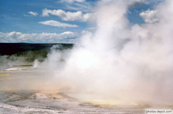 Alignement de geysers fumants, USA, Wyoming, Yellowstone