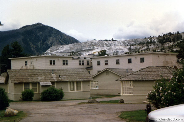 Batiment devant Mammoth hot spring, USA, Wyoming, Yellowstone