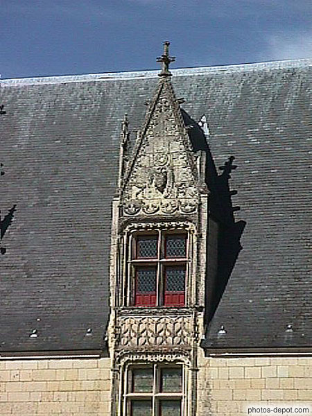 Fenêtre dans le toit aux pierres sculptées, France, Bretagne, Blain