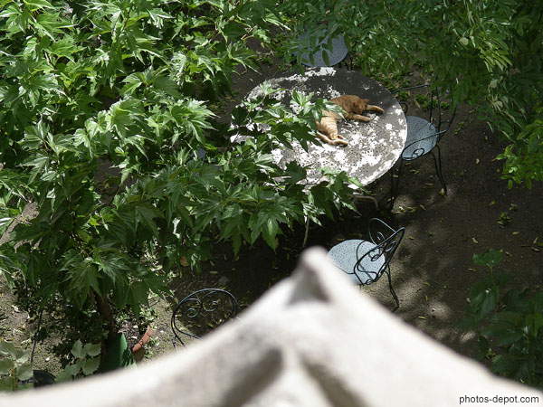 Chat allongé sur une table dans un jardin, France, Languedoc Roussillon, Carcassonne