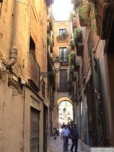 Passage ouvragé gothique à colonnes entre les maisons, Espagne, Barcelone