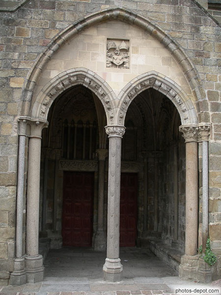 Entrée du porche surmontée du blason de l'évéché, de la Cathédrale St Samson, France, Bretagne, Dol de Bretagne