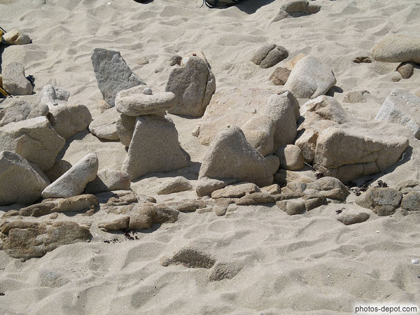 Mini mégalites construits en 5mn sur la plage, France, Bretagne, Locmariaquer