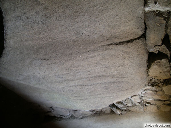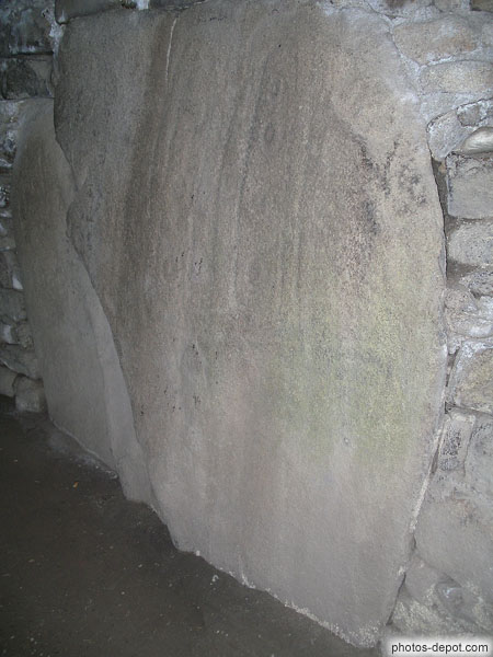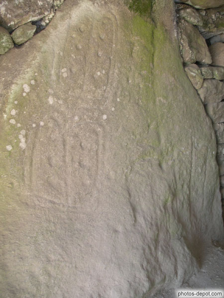 Pierres sculptées dans la chambre funéraire du dolmen des pierres plates, France, Bretagne, Locmariaquer