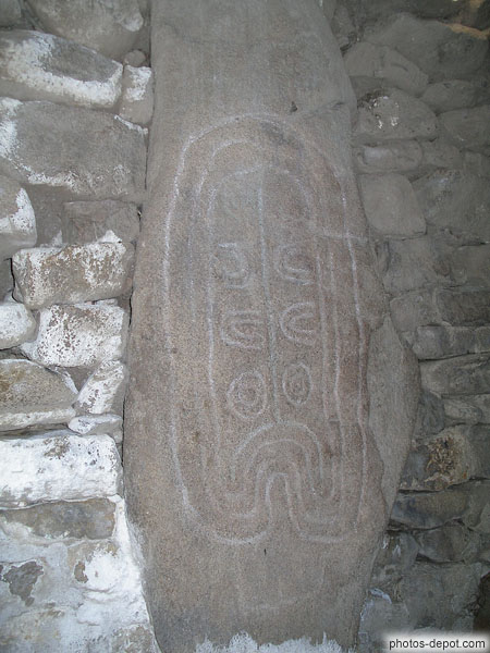 Sculptures sur pierre à l'entrée du dolmen des pierres plates, France, Bretagne, Locmariaquer